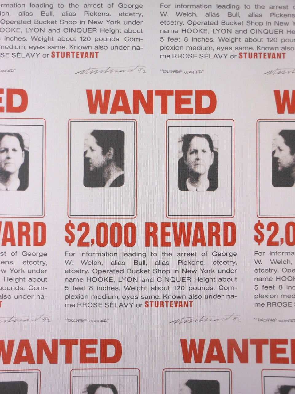 En 1992, Sturtevant a créé une série d’œuvres s’inscrivant dans l’héritage de Duchamp, dont elle avait déjà endossé la personnalité à plusieurs reprises depuis 1966. En 1969, elle avait joué avec son statut de « hors-la-loi » – résultant métaphoriquement de ses appropriations – en modifiant le collage photographique de Duchamp intitulé Wanted par l’insertion de son propre nom et de ses mensurations. À partir de ce petit collage, elle a créé, en 1992, le motif de son premier papier peint, construit sur la répétition de l’image combinée à l’inscription répétée « Wanted », poussée à un paroxysme d’auto-ironie.