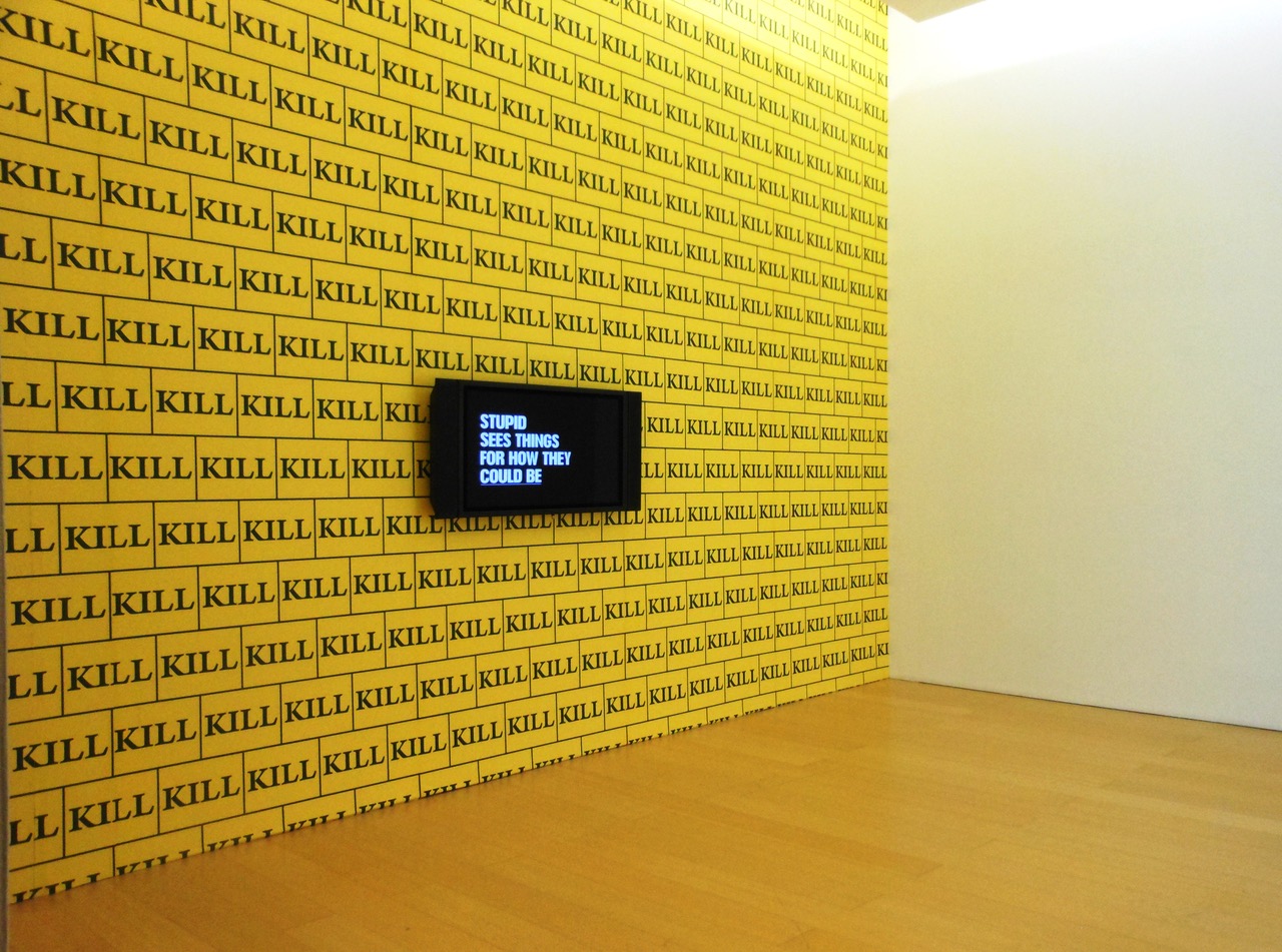 4. Sturtevant, Kill (papier peint), 2003 et Stupidity, 2013 ; photo : Teresa Lucia Cicciarella. Vue de l’exposition « Sturtevant Sturtevant », Naples, MADRE, 2015. Crédits pour l’œuvre de Sturtevant : Sturtevant Estate, Thaddaeus Ropac Gallery.