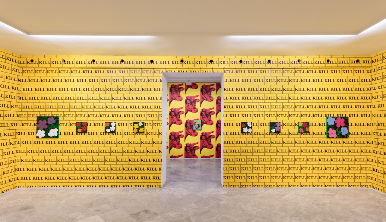 C’est de ces réflexions qu’est né, en 2003, pendant les mois de l’invasion américaine en Irak, le papier peint Kill, une référence chromatique et littérale à Kill Bill : Volume I (2003) de Quentin Tarantino.