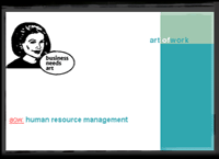 Visually, AOW takes the form of a questionnaire in several parts for creating a categorized database of artists and corporations. One hesitates before its serious and professional appearance, its colour scheme of sparse and clinical blue-green rectangles. Is this "serious"? Ambiguity prevails — even if one notices, among other things, the ironic touch of a fifties-style commercial illustration in the upper left of each page, depicting a young woman uttering: "business needs art." Besides, as one progresses through the questionnaire, subversive intentions become apparent — as in the spelling test, where the choice of words ("agitation, bureaucracy, detournement, sabotage, proletariat, revenue, irational…") is obviously far from innocent; right up to the last page, "Work Resource Mismanagement," "for the artist/activist" to exchange tips on ways for "exploiting the workplace," for "improving the workplace by disruption, renegotiation of space, etc." AOW is thus another work from net.art that insists on the Web's vocation for communication and collaboration, where text remains the primary material, rather than the images which only encourage passive consumption. Faced with a work such as AOW, one cannot help thinking: could this be true, after all? Could the Web really have the potential that some utopian thinkers (such as French artist Pierre Lévy, or Natalie Bookchin and Alexei Shulgin in Introduction to net.art, commented on this page) ascribe to it of "changing the world?" One can at least say that with net.art and works such as AOW in its arsenal, the Internet has the power to seriously (or playfully) reassess itself.