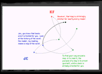The work truly offers a picture of the conversation using a set of diagrams illustrating the spatial relationship between the parties of the exchange, bringing a certain clarity to a chaotic situation. The arrows and the paths they take between authors, the appearance and disappearance of utterances, are so many ingredients, images, and figures that speak of the circular nature of the exchanges, of directions taken on and off topic, of exits. The new context of the Web and its spatial structure are thus the subject of an attentive and stimulating exploration. The project recalls other experiences of the same kind, especially Cyberatlas, a set of thematic maps of cyberspace devised by Jon Ippolito and presented by the Guggenheim on the Web. At the source of this proposal was the same concern for understanding the nature of this space, its structure and its contents.