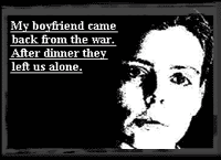 Olia LialinaMy Boyfriend came back from War 1996 Early in the Web's evolution, the most widely used browsers (Netscape 2.0, Explorer 3.0) allowed for the possibility of rendering frames and of producing more dynamic layout of html pages. By breaking down the area into zones, some of which could remain on screen while others were replaced and modified, frames helped revitalize Web space. One of the most indisputably striking artistic projects to make use of frames was My Boyfriend Came Back From War, by artist Olia Lialina, who demonstrated an understanding of the technology's narrative and dramatic possibilities, all the more effective for the sober aesthetic of her work. The image of a couple seated back to back serves as a reference point throughout the work. Amid all the activity that surrounds them and modifies our reading of the relationship, the image and the rapport be-tween the figured characters remain unchanged. Other parts of the screen are split into zones and sub-zones, channelling the conversations that occur into statements occupying so many increasingly small and crowded frames. Each of the conversations is a path, which the reader may take; it will always lead to the same outcome, a completely darkened window, figuring each time a possibility progressively obscured, a voice extinguished, in incomprehension, incommunicability or misunderstanding. Expectancy, lost hope, and disappearance form narrative patterns as much as they characterize the effects produced by the use of frames. They work in active correspondence in such a way as to effectively emphasize the dramatic context.