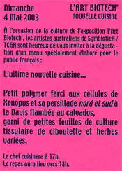 2 : Disembodied Cuisine was produced in conjunction with the L'Art Biotech' exhibition in Nantes that presented the work of 11 bio-artists.