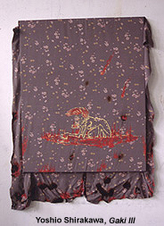 Y.S. : En partie, le tissu avec les fleurs rappelle le kimono traditionnel. De plus, les fleurs font allusion au bonheur et au paradis, alors que l’œuvre suggère l’idée que l’enfer et le paradis existent toujours un à côté de l’autre. C’est cette ambiguïté que je voulais transmettre. Ces motifs floraux sont aussi originaires des 5e et 6e siècles de Perse et de Chine. Il y a aussi un objet de prière avec les dessins de fleurs qui symbolise le corps du Bouddha et rappelle l’histoire de Bouddha qui rencontre le tigre; le tigre a faim et Bouddha lui donne son corps. Buddha a plusieur vies par ce que il est mort plusieurs fois, il se sacrifie plusieur fois.