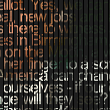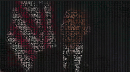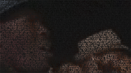 Michael Takeo Magruder's Reflection (hope and reconciliation) is the culmination of a trilogy of works framing a UK-based US expatriate's observation of the Second Iraq War, from the moments of the WTC impacts in 2001 to the Obama presidential victory speech of 2008. In this piece, a low-resolution Flash video of Barack Obama's speech (with audio), which took place in Chicago's Grant Park, glows on the screen through a mask/stencil of Obama's text. Here, perhaps more explicitly than Jenny Holzer's critical LED pieces dealing with the war that showed at the Chicago MCA in 2008-09, Magruder's screens/walls of text embed and foreground the subtext of the subjects, the people, behind them. Through the screen-sized paragraph, one witnesses the moment of the event's unfolding; the joyous chaos downtown Chicago, the realization of Obama's "Audacity of Hope" maxim, and the metonymic linkage of the new US president with a global discourse of hope, not dissimilar to that of Kennedy during the Cold War.